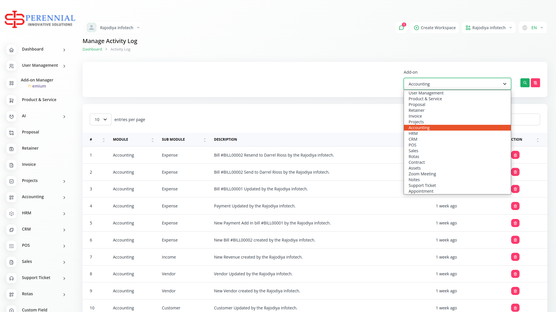 The activity log shows you the activity happening within the modules along with time and according to the appropriate formate. For example, when you create a new object inside any module and edit it, the activity log will show you that activity.