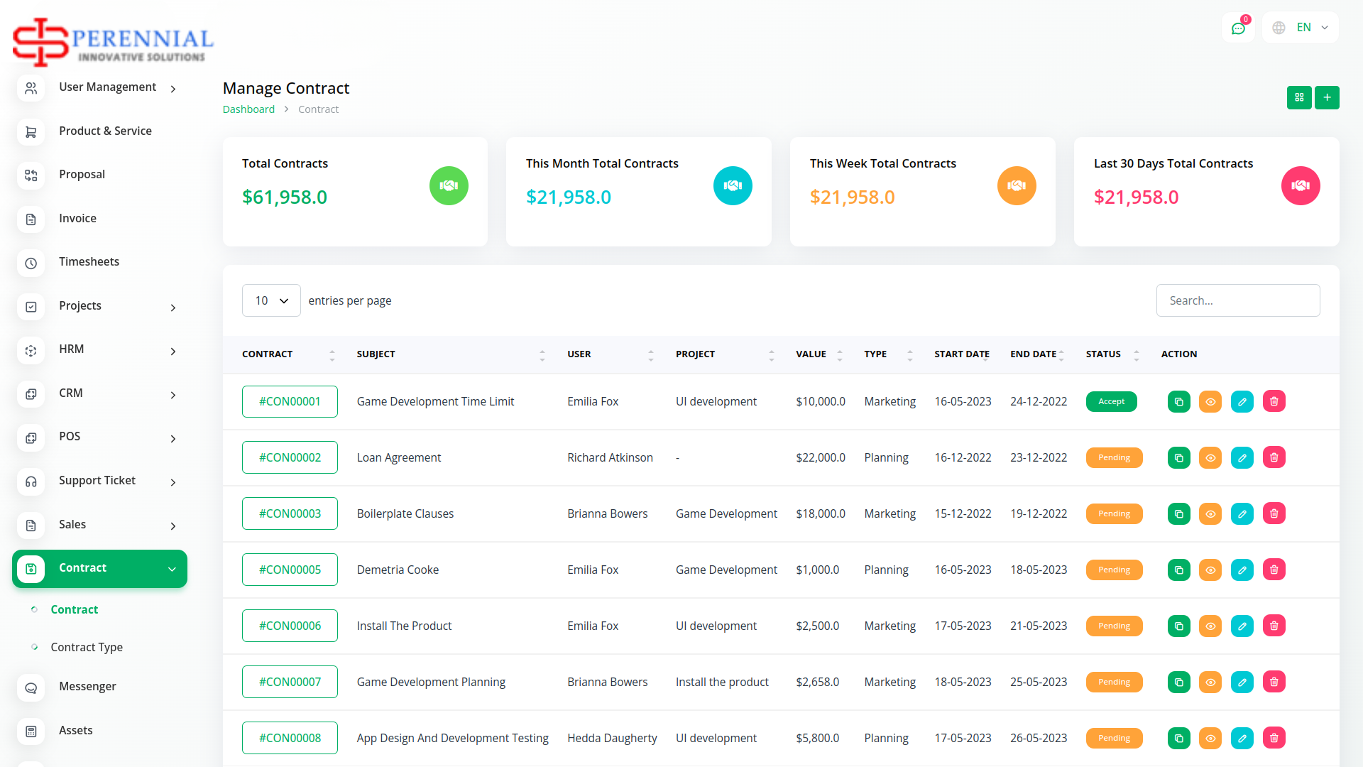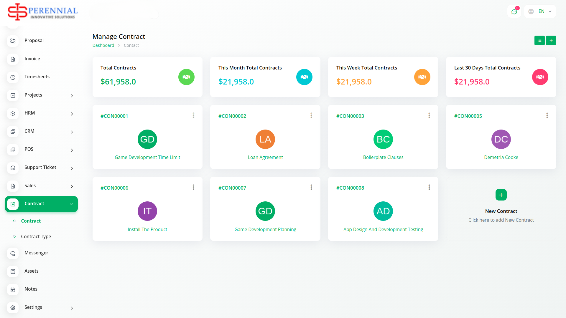 Contract Module is very helpful for proper documentation of the contracts done with clients showing the type of contract, the value, and time duration. The predefined settings can be done/ updated through Setup.